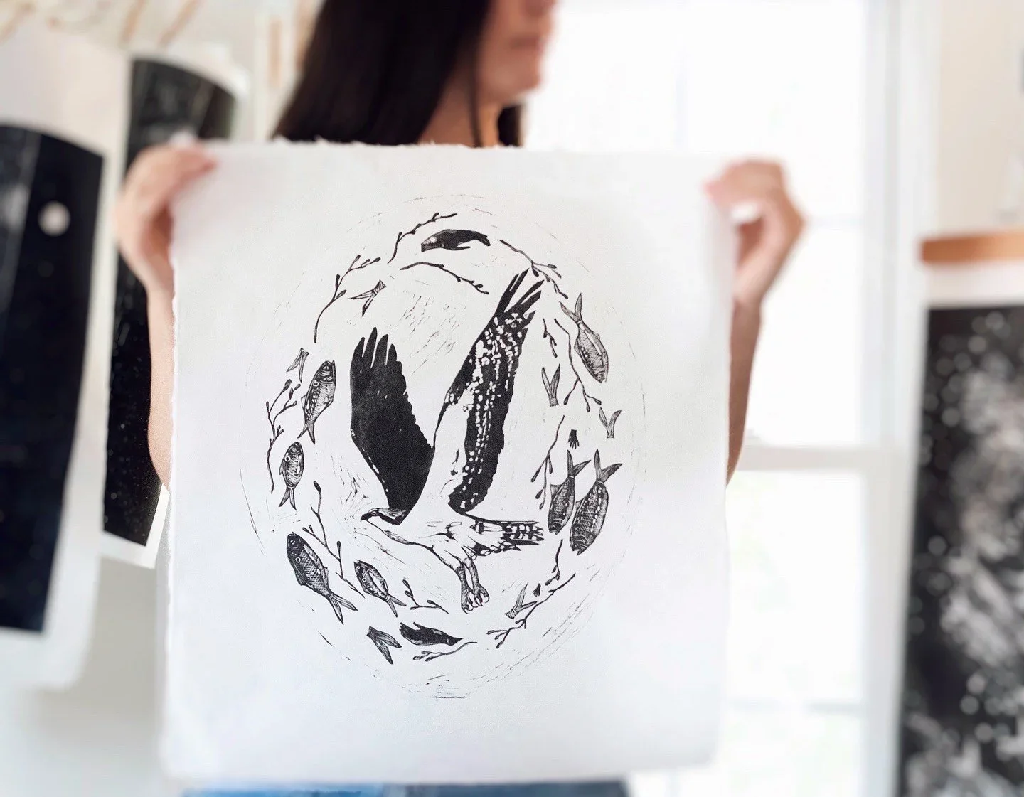 This hand-carved print features Osprey, Menhaden, and Widgeon grass woven together to honor the life and movement of the Chesapeake Bay. Each piece is printed by hand on archival paper and shipped once the ink is dry. Be sure to explore the rest of the shop!