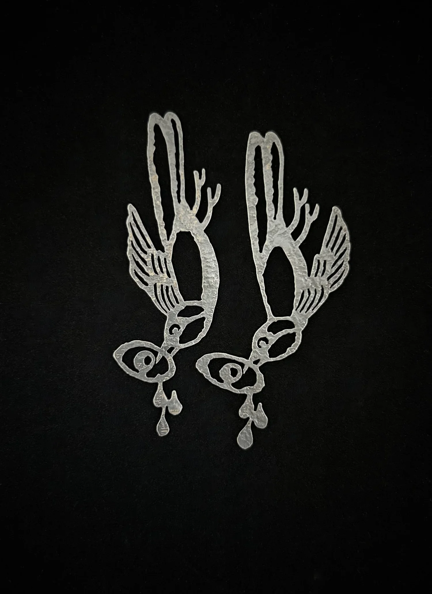 Inspired by Tim Skirven’s print ‘Weightless’ at Va MOCA, these earrings are handcrafted by Jessica C Folck. Sterling silver with a hammered texture and dark patina finish—art you can wear!