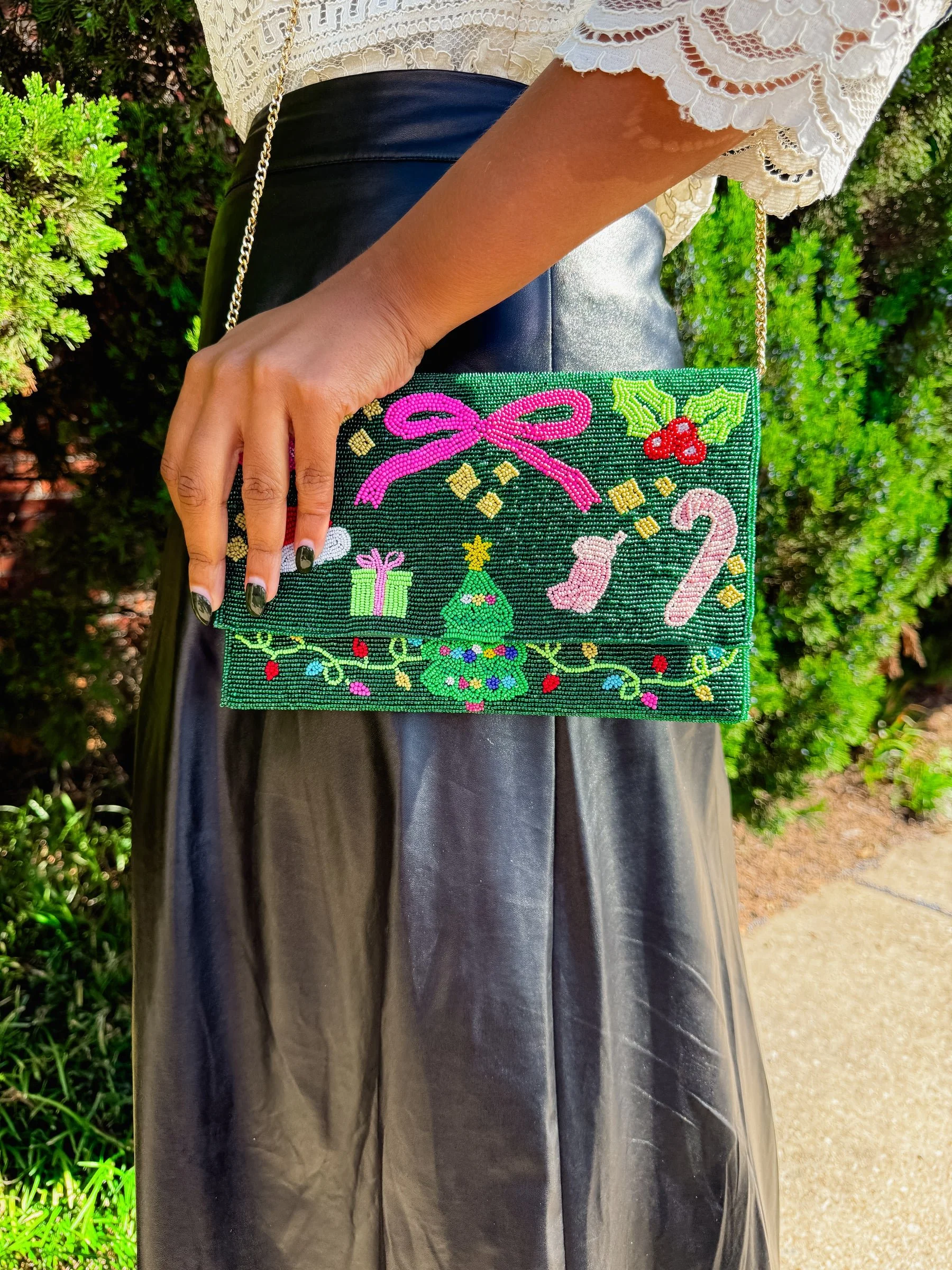 Get your holiday sparkle on! Perfect for parties, festive nights out, or just feeling merry, this playful bag keeps your essentials close and your style on point. Cute, fun, and totally giftable.